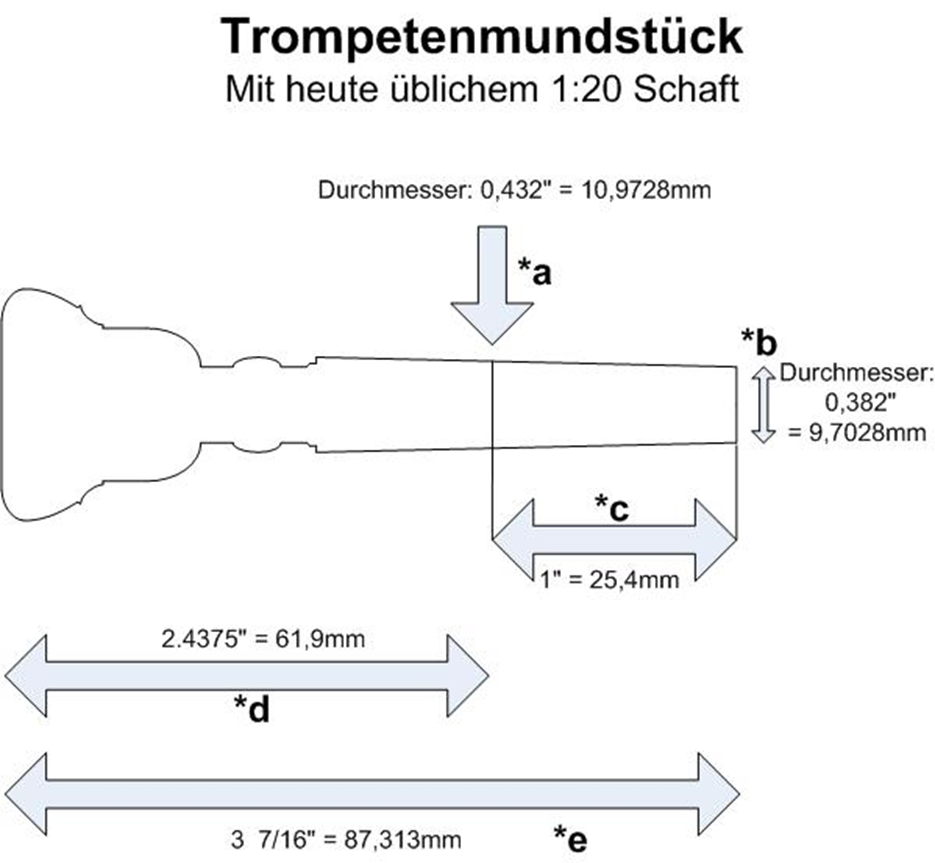 Heutzutage wird für den Konus für TROMPETENMUNDSTÜCKE (!!! Flügelhorn siehe unten!) ein Kegelverhältnis von 1:20 gewählt. (d.h. auf 20 mm Länge, steigt der Durchmesser um 1.0 mm) Dies ist seit ca. den 50er Jahren den Fall, sodass heute fast alle käuflich zu erwerbende Mundstücke in alle jüngeren Trompeten passen.