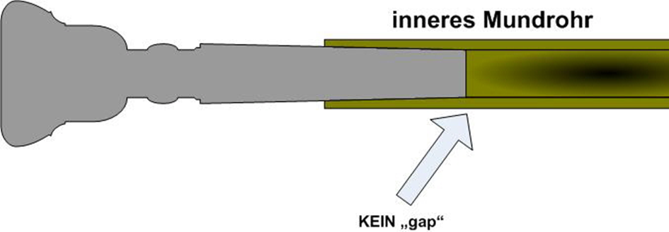 Das Mundstück steckt also in dem inneren Rohr, an dem es keine Zwinge gibt. Der Übergang von Mundstückende zum Rest des Rohres ist also Übergangs und Stufenfrei. Hier gibt es also kein gap. Wenige, ganz abgedrehte Hersteller produzieren sogar Mundrohre, wo Mundstück und Mundrohr aus einem Stück bestehen! Einfach weil sie der Meinung sind, dass dies die optimale Variante darstellt. Sprich, keinerlei Übergang von Mundstück zu Mundrohr. Keine Schlechte Idee, dämmt es doch die Flexibilität stark ein und ein Mundstückwechsel wirkt sich deutlich negativ auf die Geldbörse aus. Aber keine Sorge! Alle Varianten klingen, sind spielbar und haben einen guten Ton! (absolute billig-Teile mal aussen vorgelassen.)