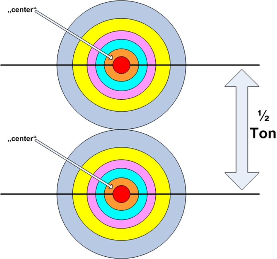 Schwierig. Daher versuche ich es mal anders. Vieles der Herstellergeschichten konnte ich für mich pers. nicht feststellen/nachvollziehen. Eines allerdings schon. Den „zentrierteren Ton. Was heißt das nun wieder? Betrachten wir uns die Abbildung unten. Wir haben zwei Töne, einen Halbtonabstand und das Rote stellt den perfekt intonierten Ton dar. Der größte Kreis ist also ein um einen Viertelton „verstimmter.