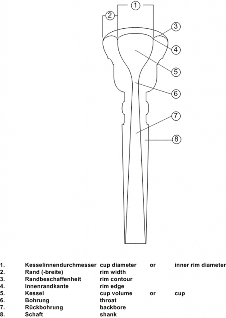 Was die Maße und die Namensgebungen angeht, machen auch hier die Hersteller die unterschiedlichsten Angaben was wiederum grosse Verwirrung stiftet. Geht man vom unausgesprochenem Standard aus (7C vom Hersteller Bach ,- dass muss nun leider erwähnt werden), der tiefenmäßig ein gesundes Mittelmass darstellt, gibt es davon ausgehend flachere oder tiefere Kessel. Man könnte jetzt verallgemeinern, dass tiefe (tiefere) Kessel einen vollen und leicht dunklen Ton ergeben und sich besonders gut für tiefere Lagen eignen und flache Kessel eher das Spielen in hohen Lagen erleichtern, allerdings auch gleichzeitig das Volumen am Ton benachteiligen. Im Endeffekt ist also wieder alles Geschmacksache und das Gesamtergebnis sollte einem einfach nur gefallen und Sinn ergeben. Es gibt auch hier wieder Leute, die auch das C mit einem extratiefen Kessel spielen können und andersrum wieder Leute, die auch wunderbar die tiefsten Töne mit einem flachen Kessel tönen lassen können. Was einem nun die eine Sache erleichtert, kann dem anderen so gar nichts bringen. Deshalb kann man sich auch hier wieder nur auf seine Intuition verlassen. Im Zweifel oder gerade für Anfänger wird dann gerne auf den Standard zurückgegriffen, dem Mittelmass aller Dinge, dem „7C.Ein zu tief gewählter Kessel, könnte auch bei einigen dazu führen, das Instrument zu stark anzupressen, um mangelnde Tonhöhe auszugleichen. Die Lippen werden dann nicht mehr genug durchblutet und schon ist Feierabend. Ist er zu flach, fehlt es ggf. an tiefen Frequenzen, welche nicht mehr sauber übertragen werden könnten und wenn man es wirklich übertreibt (zu flach wählt), könnten die Lippen, welche ja schwingen sollen, gar an das Kesselinnere selbst stossen und somit jeglichen Vorteil zunichte machen.